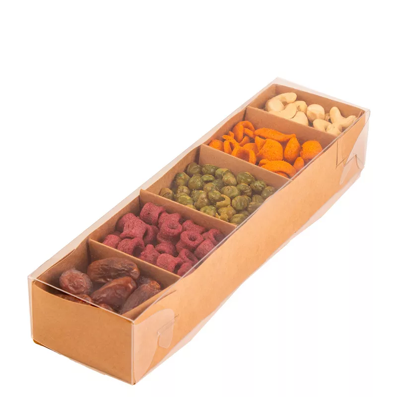 קופסת קרטון מחולקת מכסה PVC שקוף 5 תאים 30/8/5 ס"מ- חום